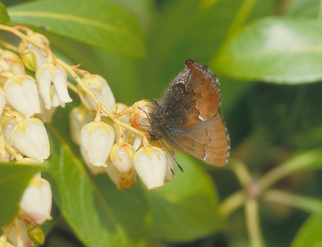 宮崎ではコツバメはそれほど多い蝶ではないが県内に広く分布している.ツツジやアセビが生える高原や渓流沿いで姿が見られる.宮崎県レッドリスト準絶滅危惧(NT-g)