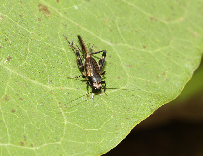 スズ類はコオロギ科ではなくヒバリモドキ科に属するので,後脛節背面に毛が生えた刺列がある.マダラスズは後腿節が白黒のマダラ模様になっている.