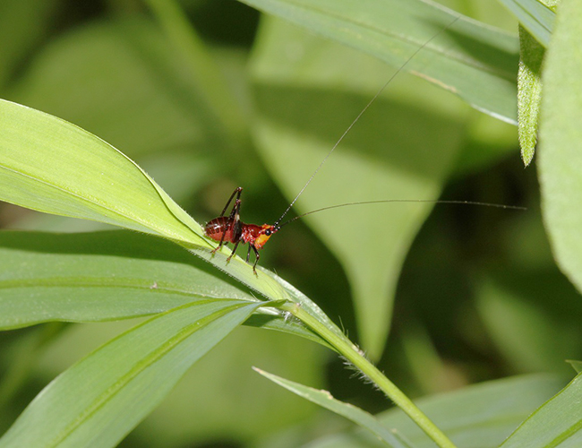 特徴的な色彩で他のササキリ類とはすぐに区別できる.若齢幼虫も,赤と黒色からなるので見間違えることはない.南方系の種で,県内各地で見られる.