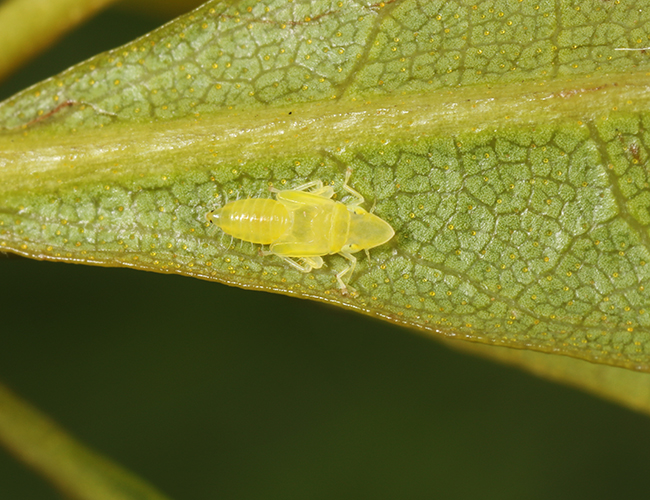 少し変わった形をした綺麗なヨコバイ.南方系で,冬でも幼虫と成虫が見つかる.