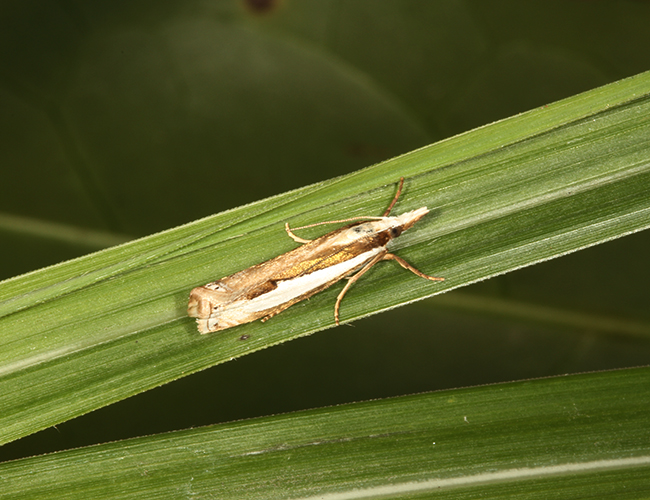 翅に白い筋がある体が細いツトガ.日本全国に分布し,県内でも普通に見られる.