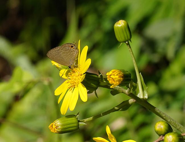 南方からやってくる迷蝶で宮崎県には土着していない.クズの花を食べるので,早い時期に飛来したときは大発生することがある.最近では2021年の秋から初冬にかけて大発生し,自然共生サイトでも確認された.翅表は光沢のある綺麗な青藍色である..