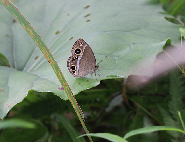 ヒメジャノメに似ているが,林内の暗い場所を好む.ヒメジャノメに比べると,翅裏の白色帯がゆるくカーブして,少し紫色がかかる.