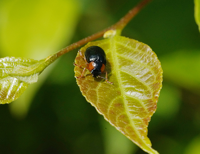 赤褐色の前胸背側縁が目立つ.個体数は多く,種々の植物を食べる.