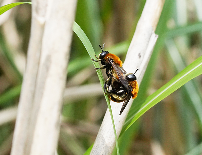金色をした綺麗なアブ.幼虫はアリの巣の中で育つ.4〜5月によく見られる.