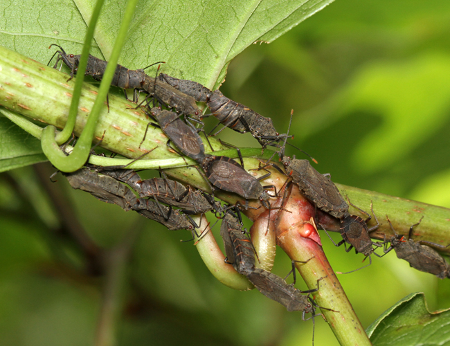 体長8.7~12mm イタドリやキイチゴなどに群生する。ツマキヘリカメムシに似ており、現地で区別することは難しい。交尾期間が長く、平均で3日、長くなると9日間も交尾するとの記録がある。この長期交尾期間は♀を他の♂と再交尾させないためとの報告がある。(五ヶ瀬町、高千穂町、日之影町、椎葉村、延岡市、川南町、小林市、高原町、都城市、綾町、国富町、宮崎市、日南市、串間市)