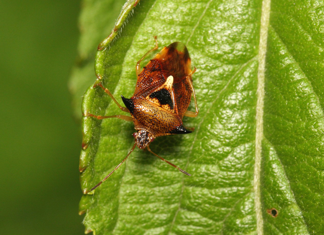 体長7〜9mm ヒメツノカメムシよりも前胸背側角が突出し,先端が黒い.ウツギやノリウツギなど,種々の樹木に寄生する.どちらかというと高標高地帯に多い.(高千穂町,日之影町,延岡市,椎葉村,美郷町,都農町,西都市,小林市,都城市,宮崎市,日南市)