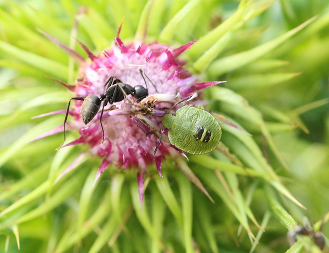 1.宮崎県えびの市末永 2015.08.23 成虫(キリシマアザミ,隣はエゾアオカメムシ4齢幼虫)