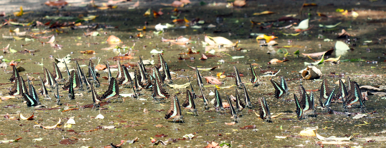 宮崎の渓流ではアゲハ類の集団吸水を見ることが多い.アオスジアゲハも地面で吸水している姿を良く見かける.口吻から水を吸ってはお尻から水を出している.小林市の林道で100〜200頭単位の集団が近くに6つ集まった1000頭近い大集団に出会ったことがある.近づくと一斉に飛び立ち,まさに乱舞で,これ程すごいのはその後見たことがない.この集団にはキチョウが少しとクロアゲハが1頭混じっているだけで殆ど全てがアオスジアゲハだった。アオスジアゲハの別亜種は東洋熱帯区に幅広く分布している.