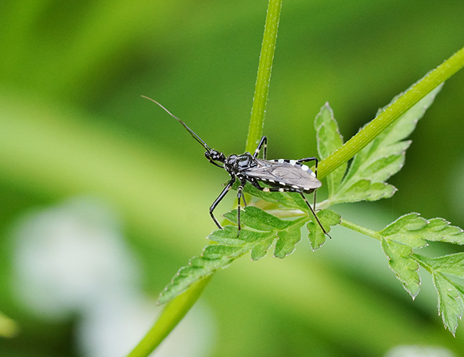 肢に白黒の縞模様があるサシガメ.鱗翅目幼虫やハムシなどの甲虫類を捕食する.
