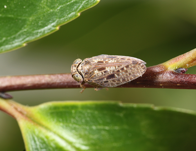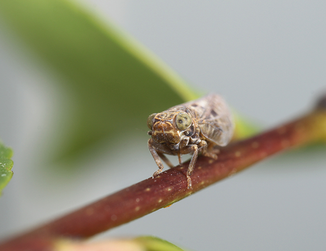 クサビウンカには顔に淡黄色斑がない.この個体はヒサカキにいた.