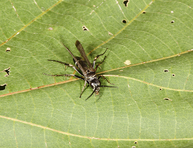 コガネグモ科のクモを狩るクモバチ.前胸背と腹部の白線が目立つ.