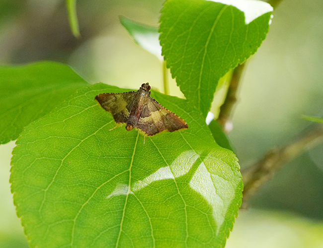 県内でよく見られるトガリメイガ.♂の翅には黄色帯が現れる.