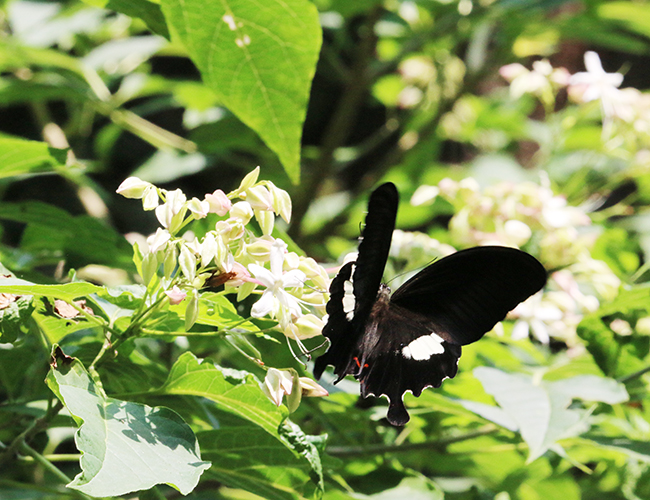 大きくて黄色い紋が目立つモンキアゲハもカラスザンショウを主な食樹としている.白からピンク色の花を咲かせるクサギは大型アゲハ類の絶好の吸蜜源になっている.クサギもカラスザンショウと同じパイオニア植物なので,伐採地にいち早く生える.