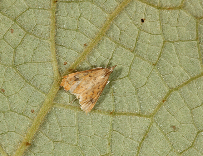 翅を三角形に畳むタイプのノメイガ.県内では普通に見られ,野菜の害虫としても知られている.