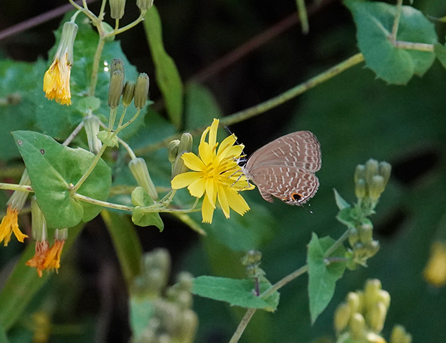 南方からやってくる迷蝶で宮崎県には土着していない.クズの花を食べるので,早い時期に飛来したときは大発生することがある.最近では2021年の秋から初冬にかけて大発生し,自然共生サイトでも確認された.翅表は光沢のある綺麗な青藍色である..
