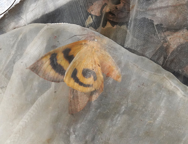 成虫で越冬する大きな蛾.MRTの森では冬に成虫を確認した.翅を閉じていると枯葉の様だが,翅を開いて後翅を出すと,大きな目玉模様が出てくる.
