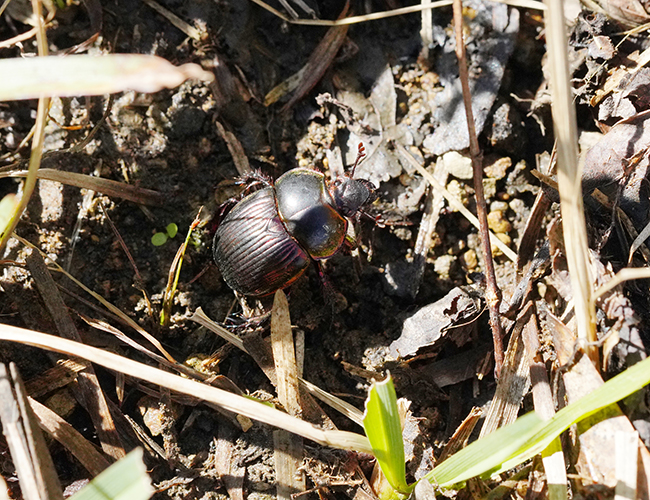 獣糞を餌とするコガネムシ.自然共生サイトのある山地にはまだ鹿が入って来ていないので,それほど数は多くない.近似種に