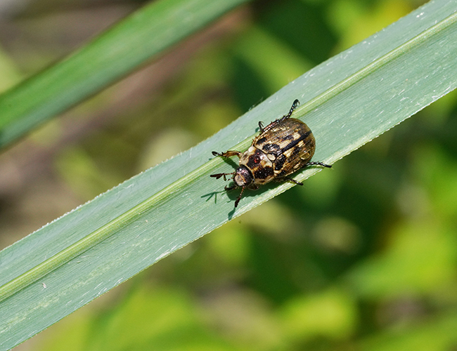 林縁の草の上などにおり,黄褐色と黒褐色のまだら模様が目立つ.