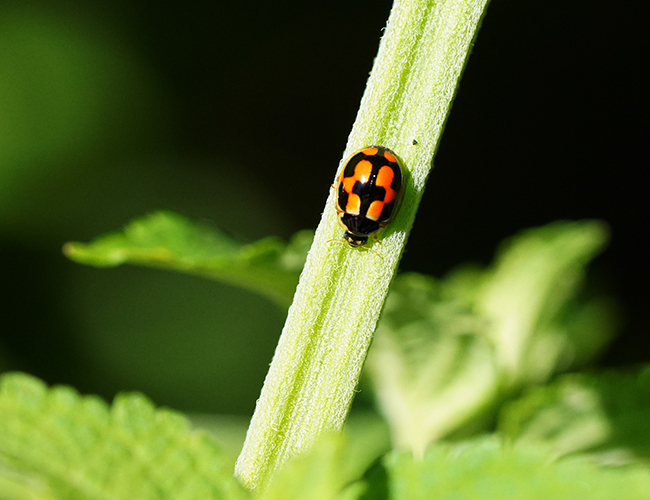 ナミテントウと同じく,よく見かけるテントウムシ.ナミテントウより一回り以上小さいが,肉食でアブラムシなどを捕食するので,天敵農薬として利用されている.