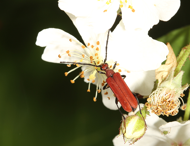 綺麗な朱色の原始的なハナカミキリ.県内での個体数は比較的少ない.