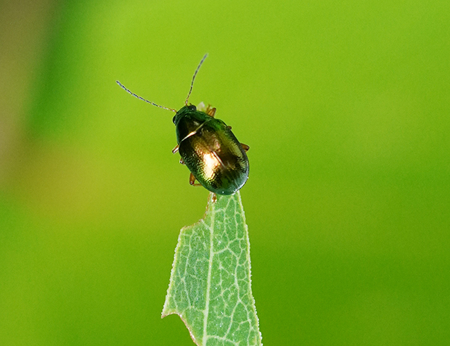 春にヒメヒオウギスイセンなどの葉の上にいることが多い.青緑色で光沢があるので,見つけやすい.