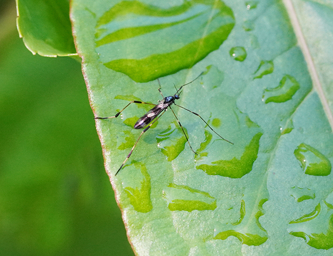 白黒の翅と肢を持ち,胸が青く光沢がある綺麗なガガンボ.加江田地区ではよく見かける.