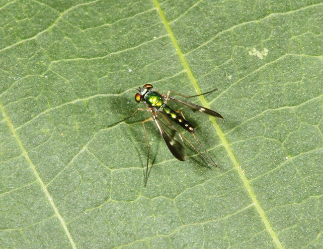 マダラホソアシナガバエの仲間は,小さいが青緑色の金属光沢がある綺麗なハエで,個体数も多い.背中と前脚脛節の刺毛で種を区別する.