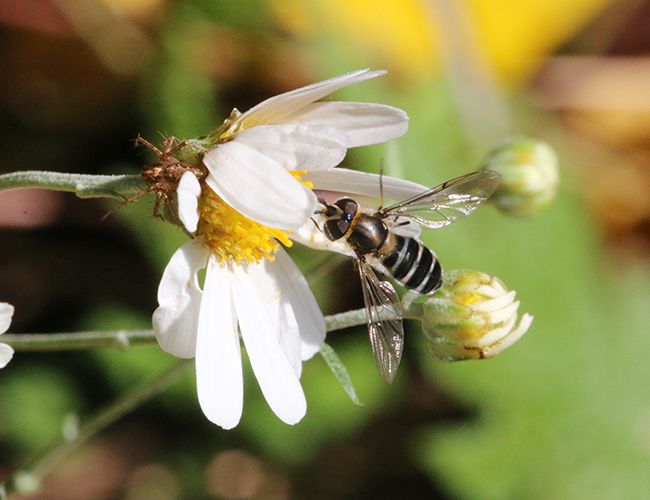 黒い腹部に青色光沢のある白い横線が目立つヒラタアブ.幼虫はアブラムシ類を捕食する.個体数は多い.