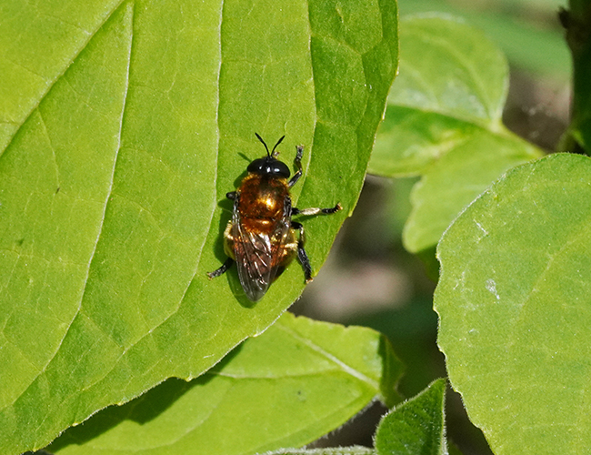 金色をした綺麗なアブ.幼虫はアリの巣の中で育つ.4〜5月によく見られる.
