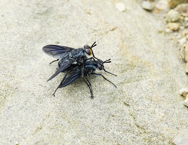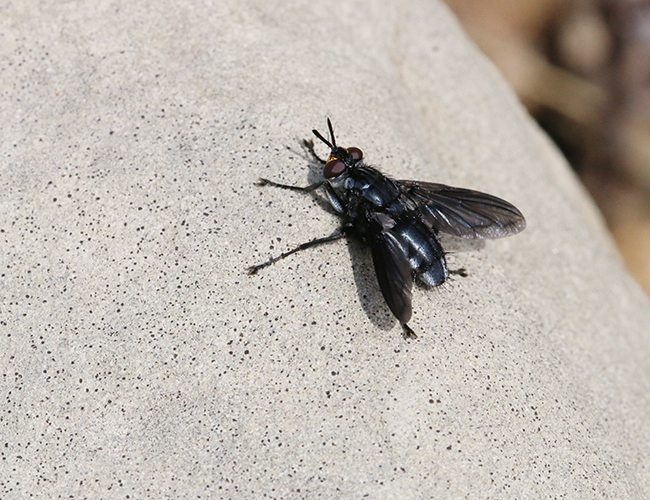 少し光沢のある黒色で触覚が長い.ハナバエとあるがヤドリバエの仲間.大きいので良く目立つ.