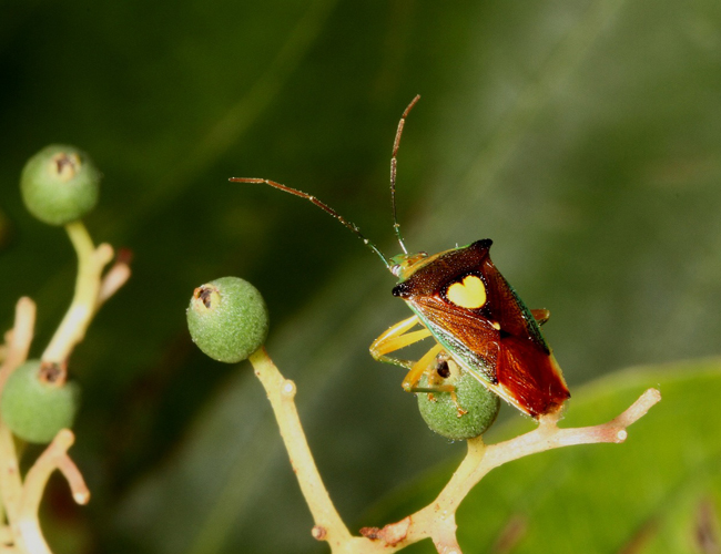 体長11〜13mm 小楯板にハートマークのある可愛らしいツノカメムシ.県内各地に幅広く分布しており,市街地近くでも見ることができる.ミズキ,チシャノキなどから見つかる.Sastragala属のツノカメムシはElasmucha属のツノカメムシと同様に,卵や若齢幼虫を保護する.ハートマークは台湾産では離れる.(高千穂町,日之影町,椎葉村,美郷町,延岡市,門川町,日向市,都農町,川南町,高鍋町,西都市,えびの市,小林市,高原町,都城市,綾町,宮崎市,日南市,串間市)
