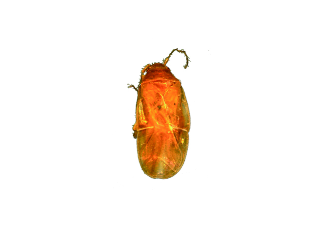 体長2mm前後 体は黄褐色で微毛に覆われる。翅は薄く透明で、楔状部の基部に深い切れ込みがある。(延岡市、椎葉村)
